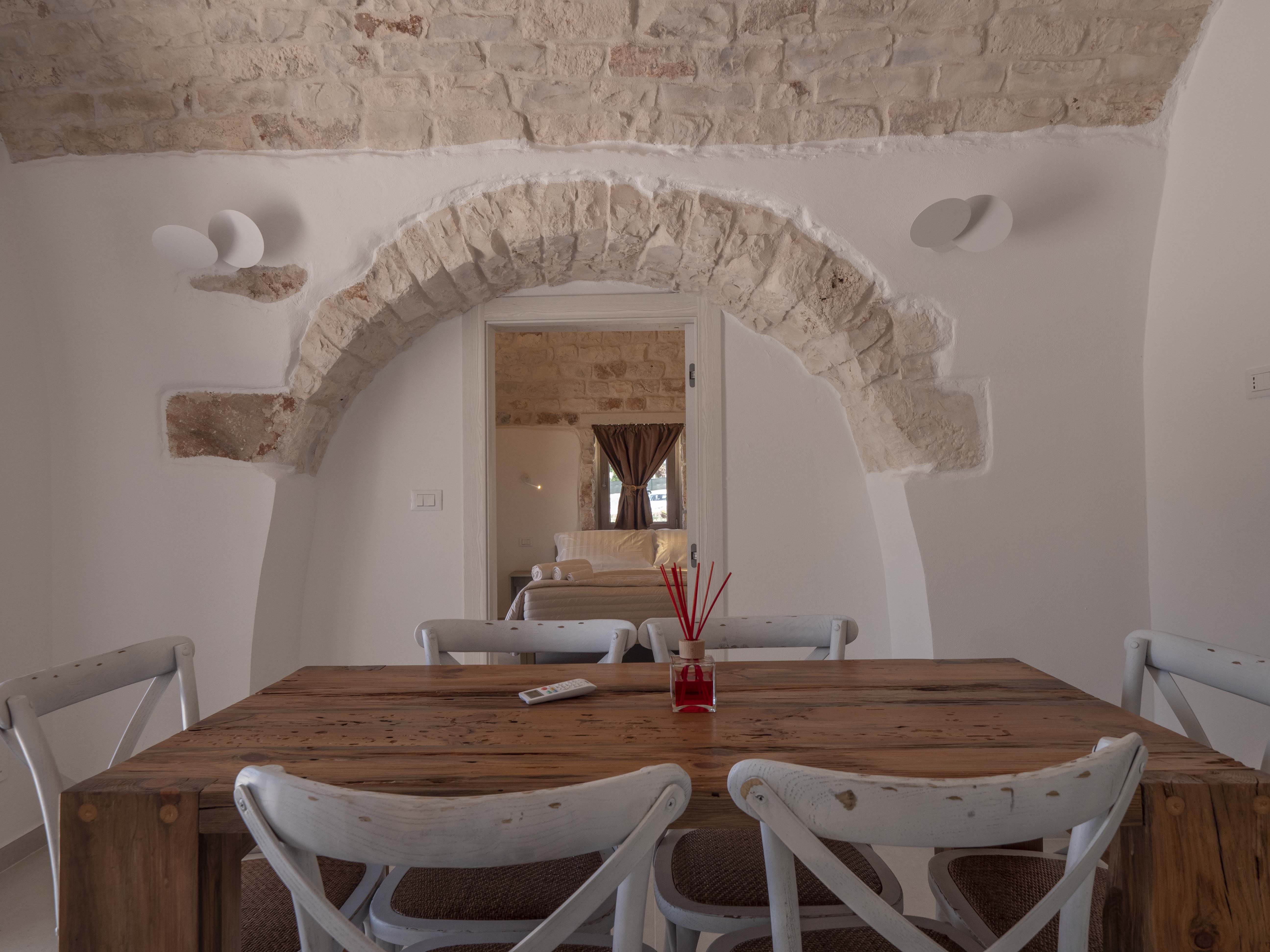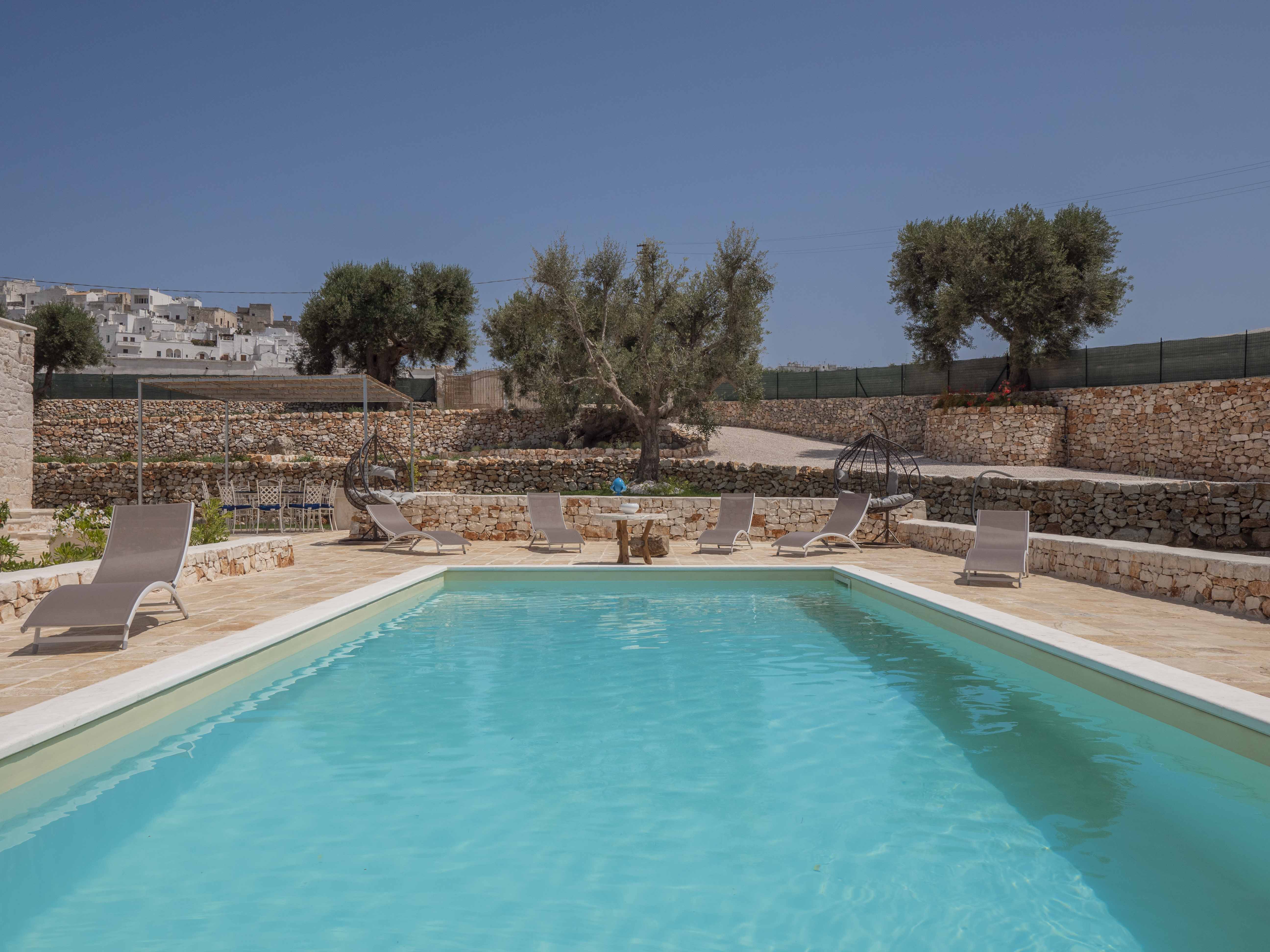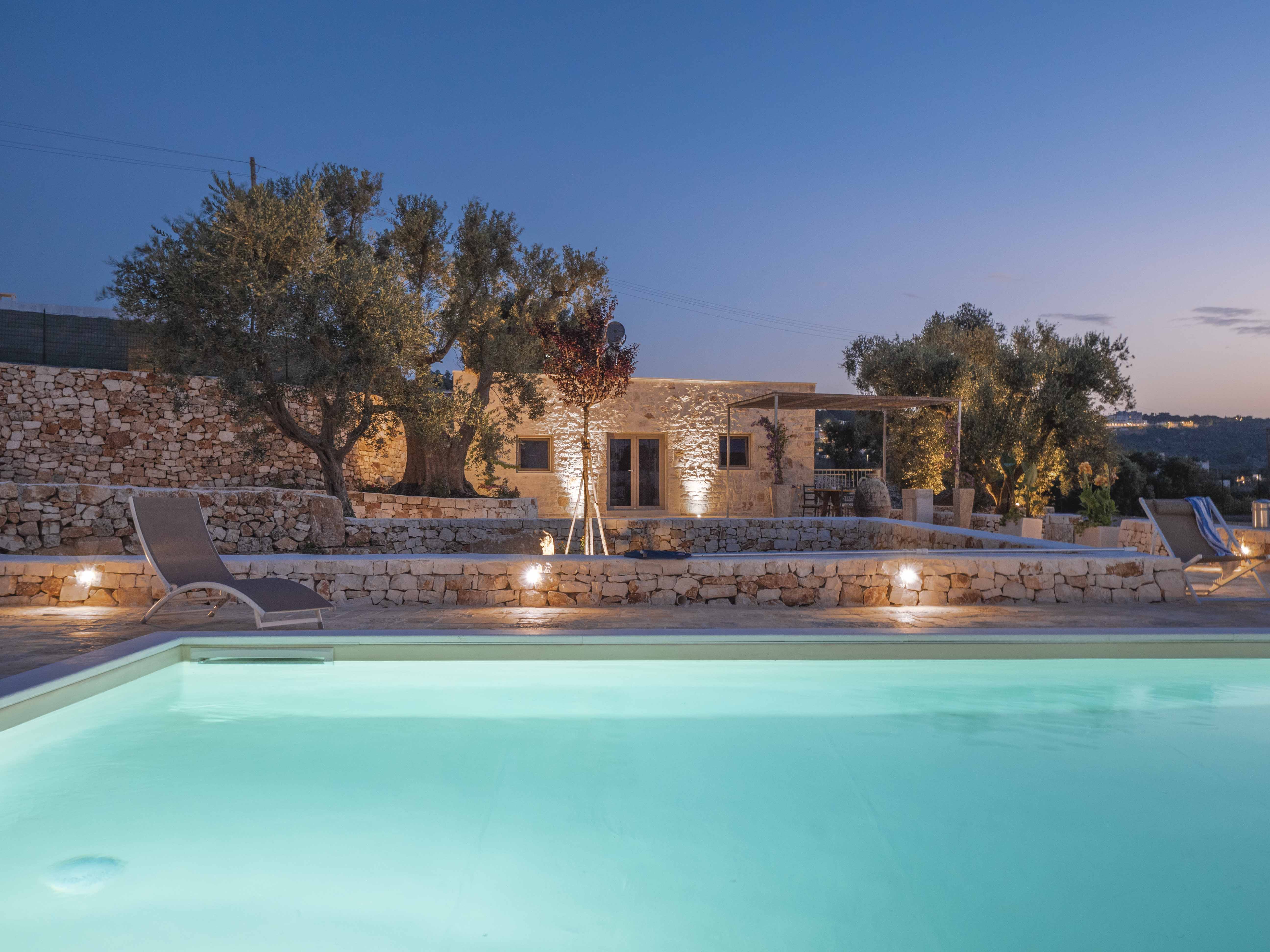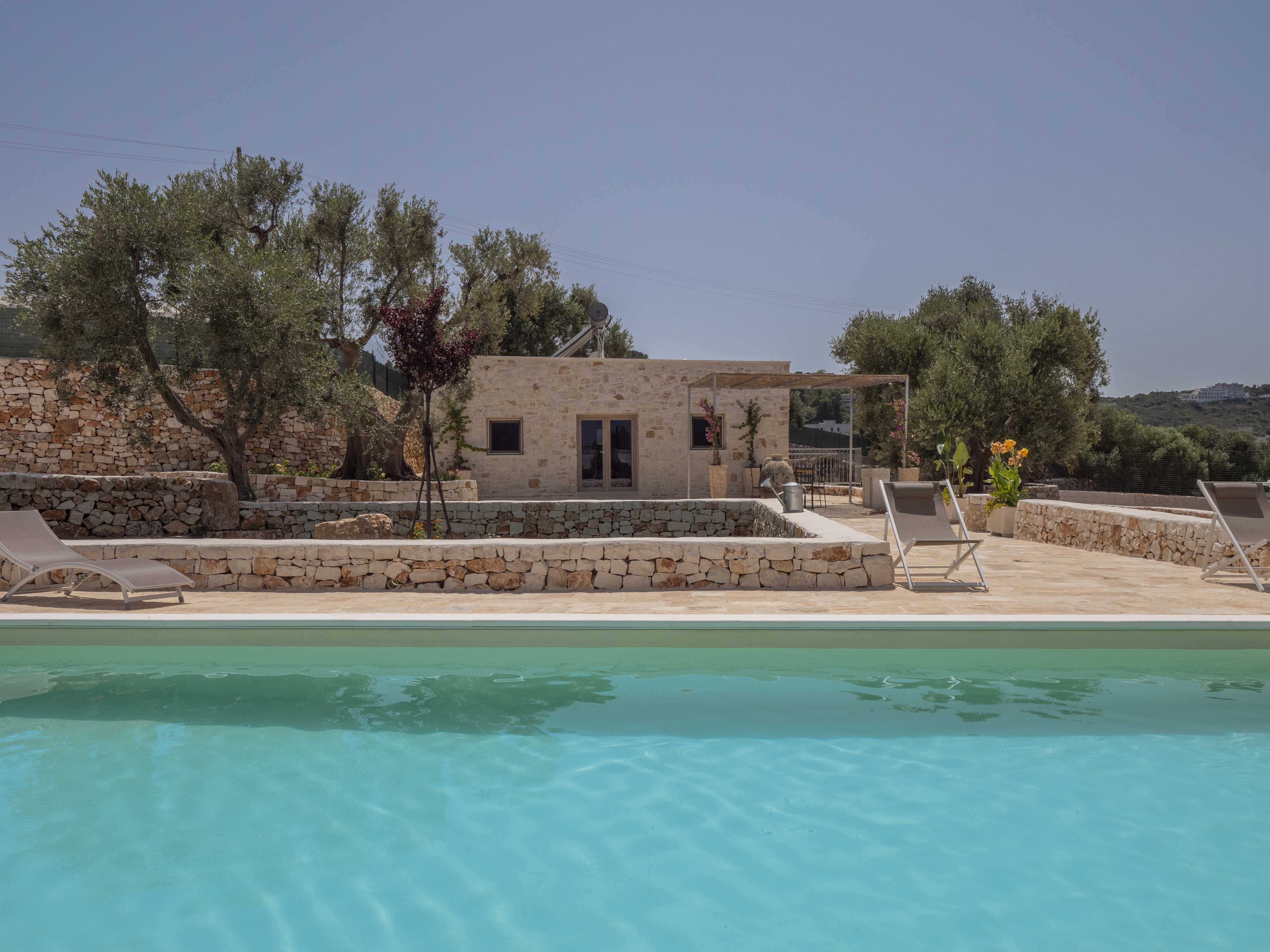 The structure consists of two independent bodies: a historic trullo with its cone vaults and a lamia with stone barrel vaults, framed by dry stone walls and ancient olive trees. Inside the trullo is a cozy living area with a dining table, where the living stone and natural light create a cozy atmosphere. Next door, under the alcove, is a functional kitchen in support of the well-equipped outdoor kitchen. The Trullo has two double bedrooms, both with both internal and independent access from outside. One of the rooms has an ensuite bathroom, while a second bathroom is available to guests, both complete with shower. A small hallway room also houses a comfortable sofa bed, ideal for accommodating two additional people or creating a private reading space.Inside the Lamia, two double bedrooms with a central bathroom complete with shower serve them. Outside, both structures have a pergola in elevation equipped with some tables and seating. In front of the pool, a large glass-enclosed gazebo gathers the outdoor kitchen equipped and complete with barbecue.