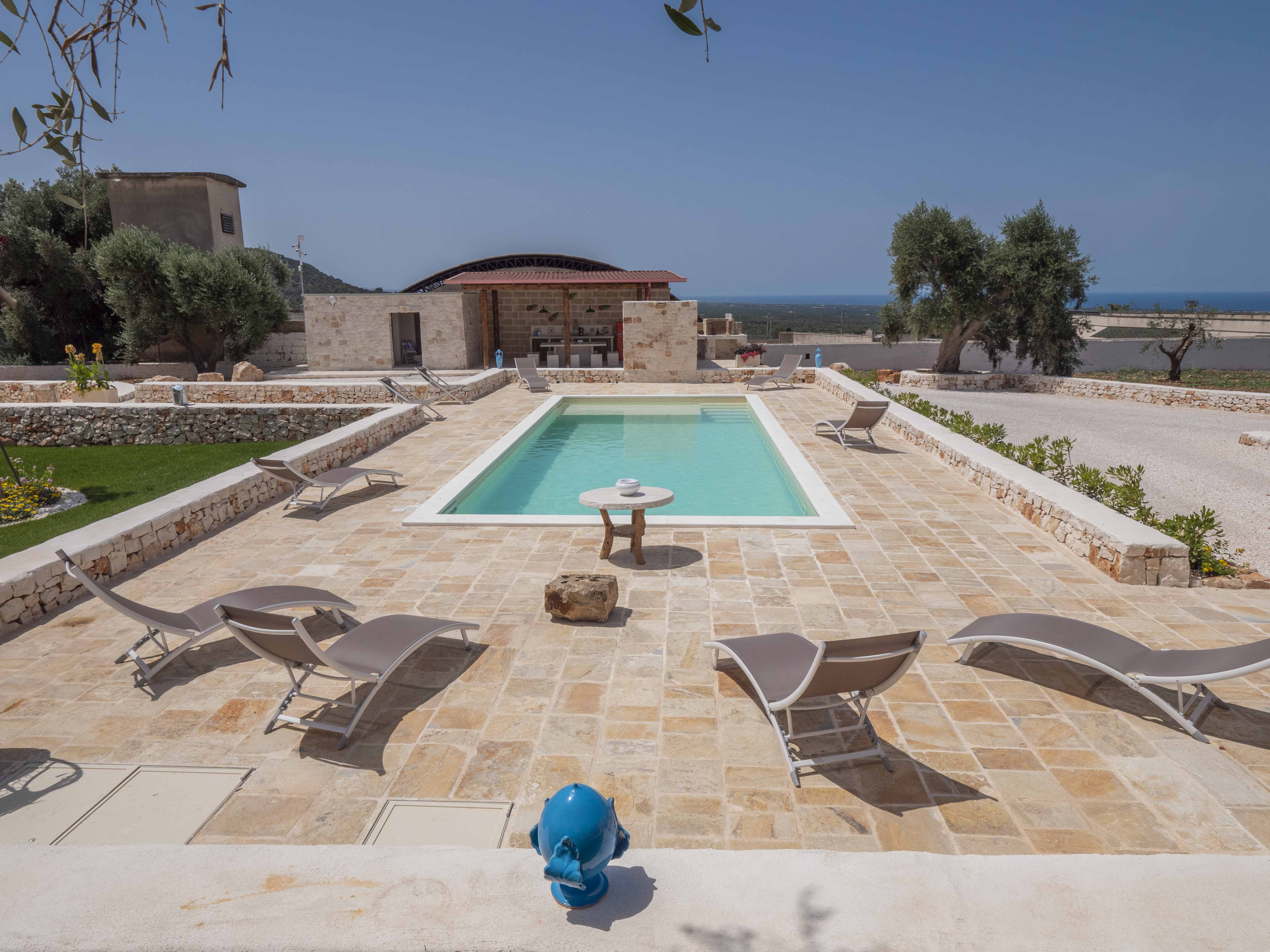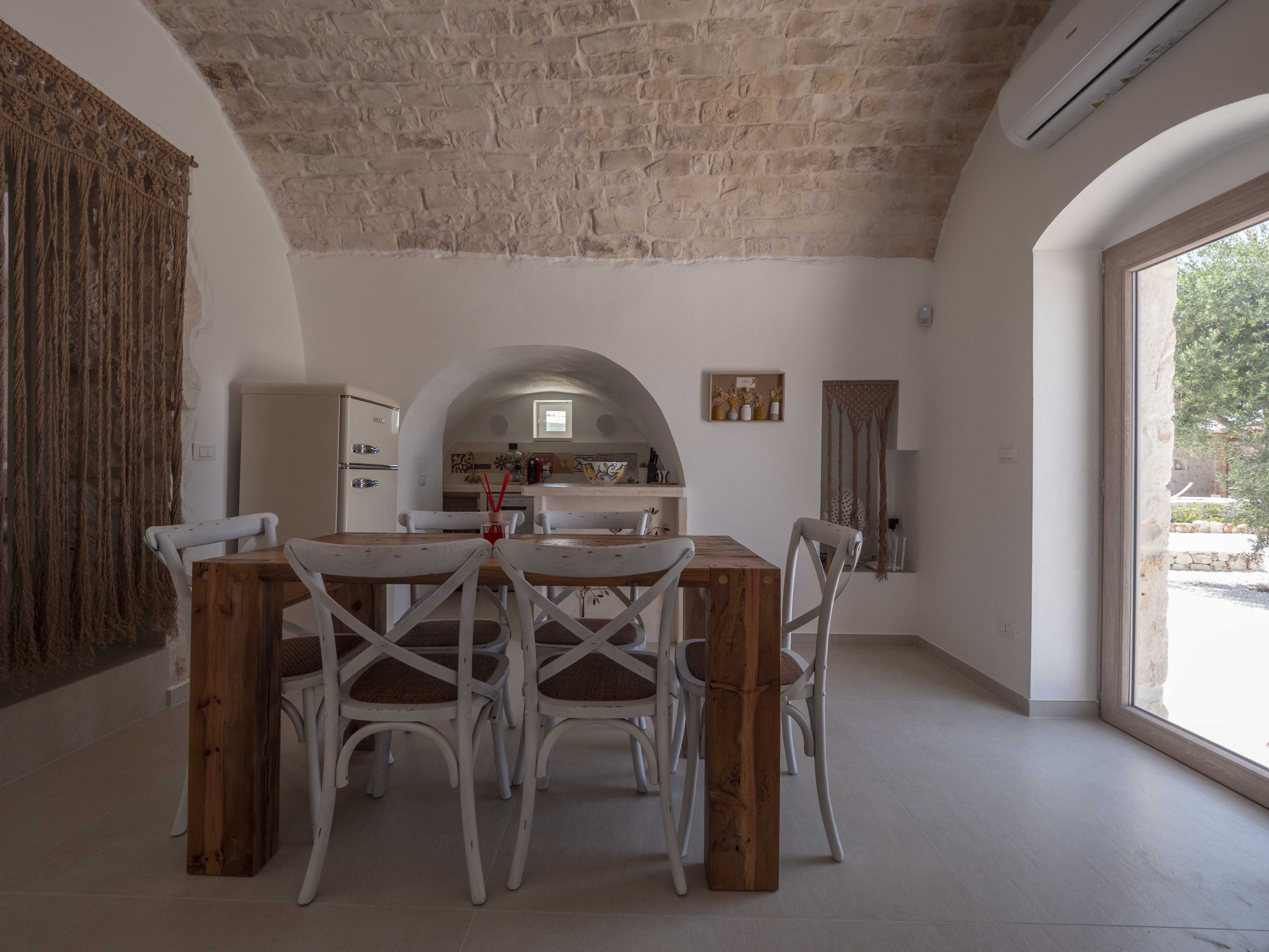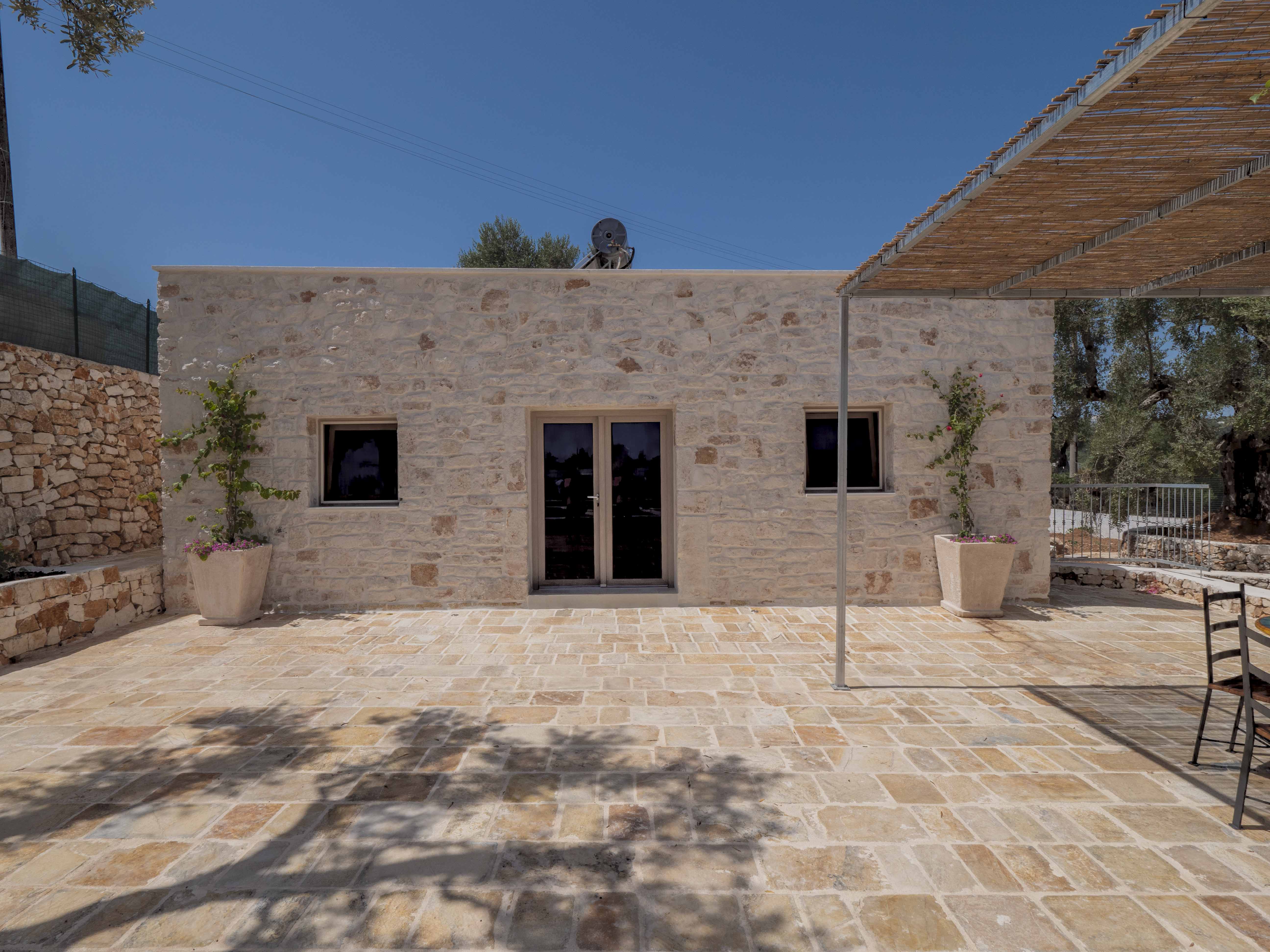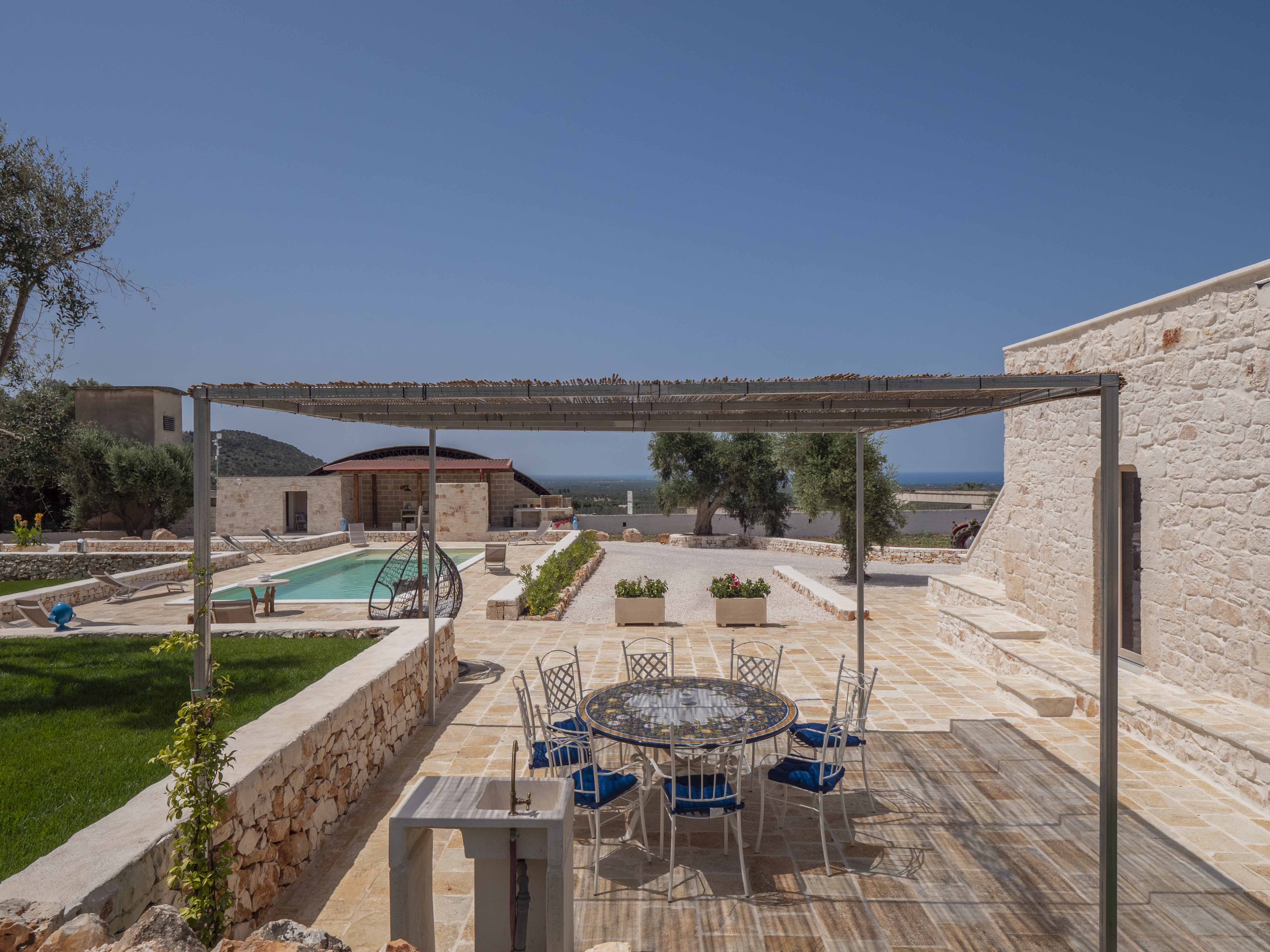 The structure consists of two independent bodies: a historic trullo with its cone vaults and a lamia with stone barrel vaults, framed by dry stone walls and ancient olive trees. Inside the trullo is a cozy living area with a dining table, where the living stone and natural light create a cozy atmosphere. Next door, under the alcove, is a functional kitchen in support of the well-equipped outdoor kitchen. The Trullo has two double bedrooms, both with both internal and independent access from outside. One of the rooms has an ensuite bathroom, while a second bathroom is available to guests, both complete with shower. A small hallway room also houses a comfortable sofa bed, ideal for accommodating two additional people or creating a private reading space.Inside the Lamia, two double bedrooms with a central bathroom complete with shower serve them. Outside, both structures have a pergola in elevation equipped with some tables and seating. In front of the pool, a large glass-enclosed gazebo gathers the outdoor kitchen equipped and complete with barbecue.