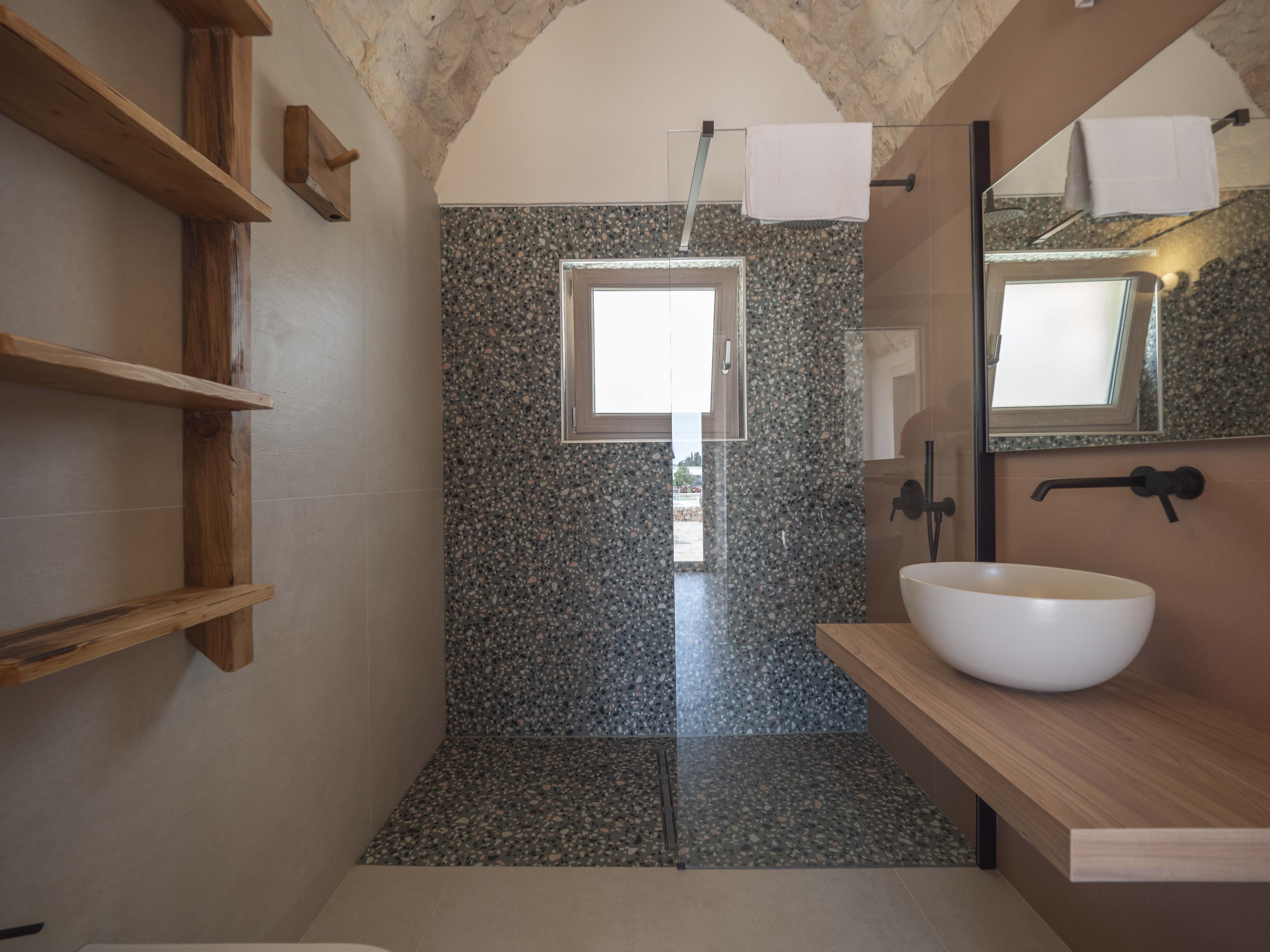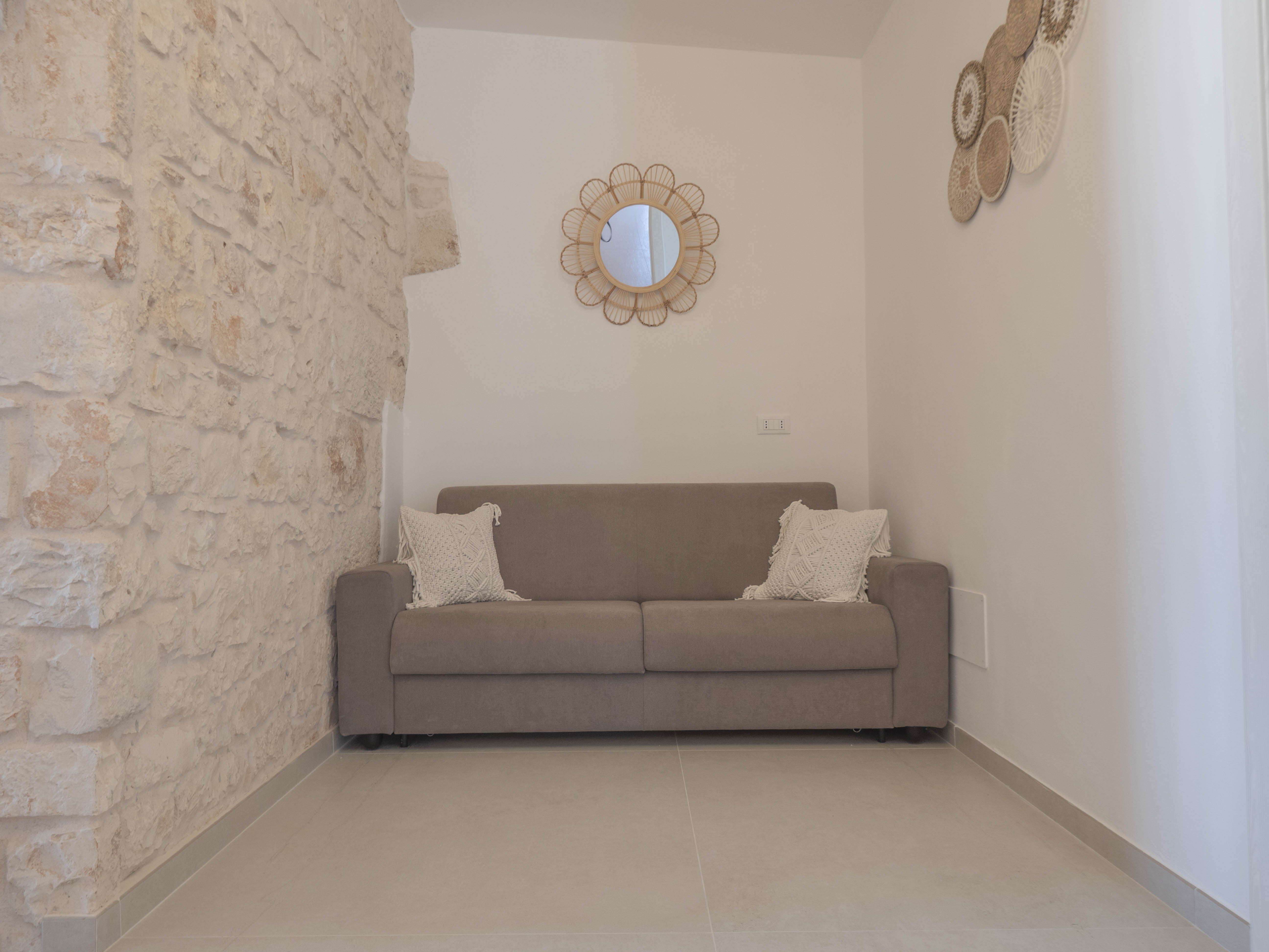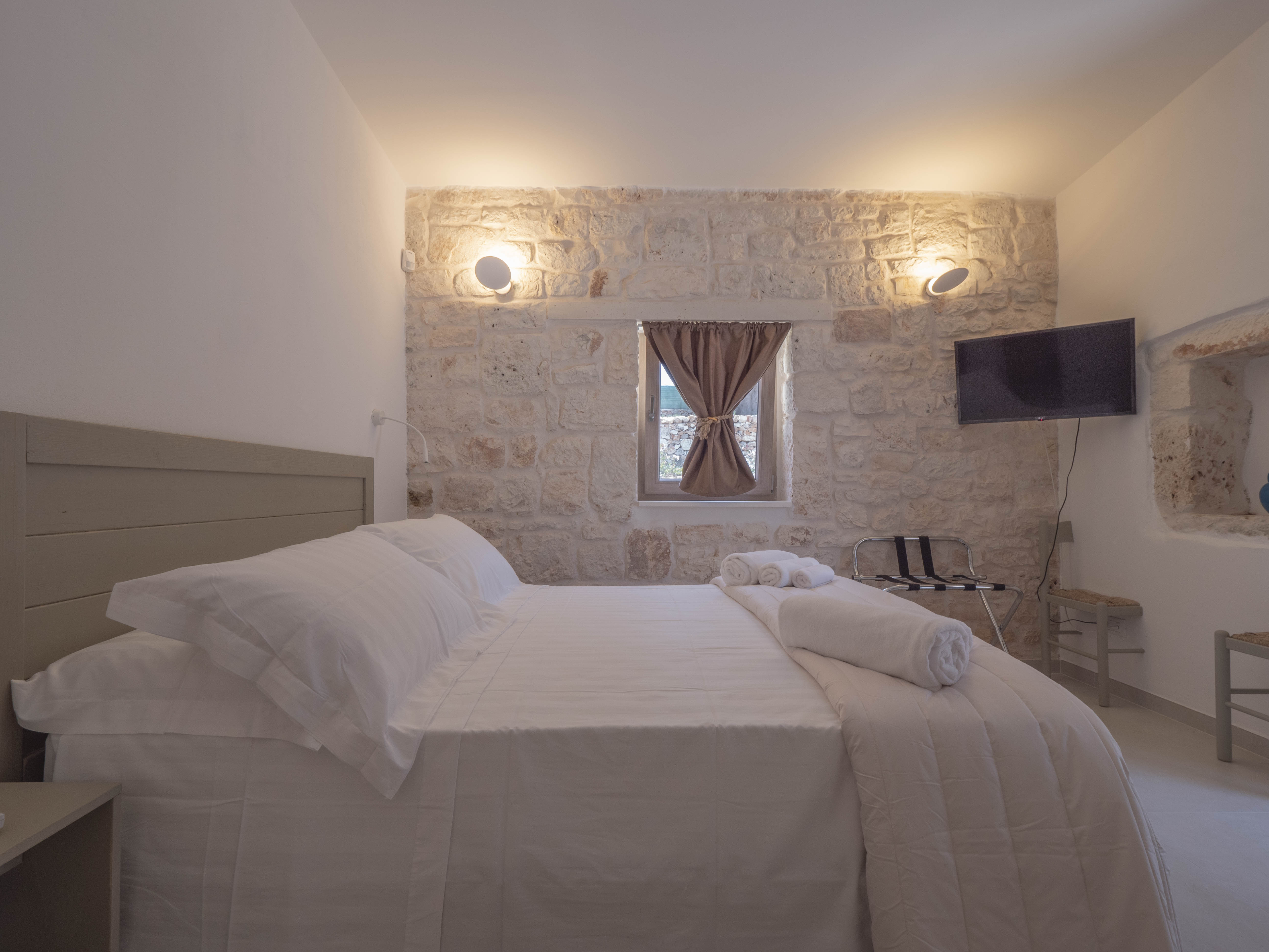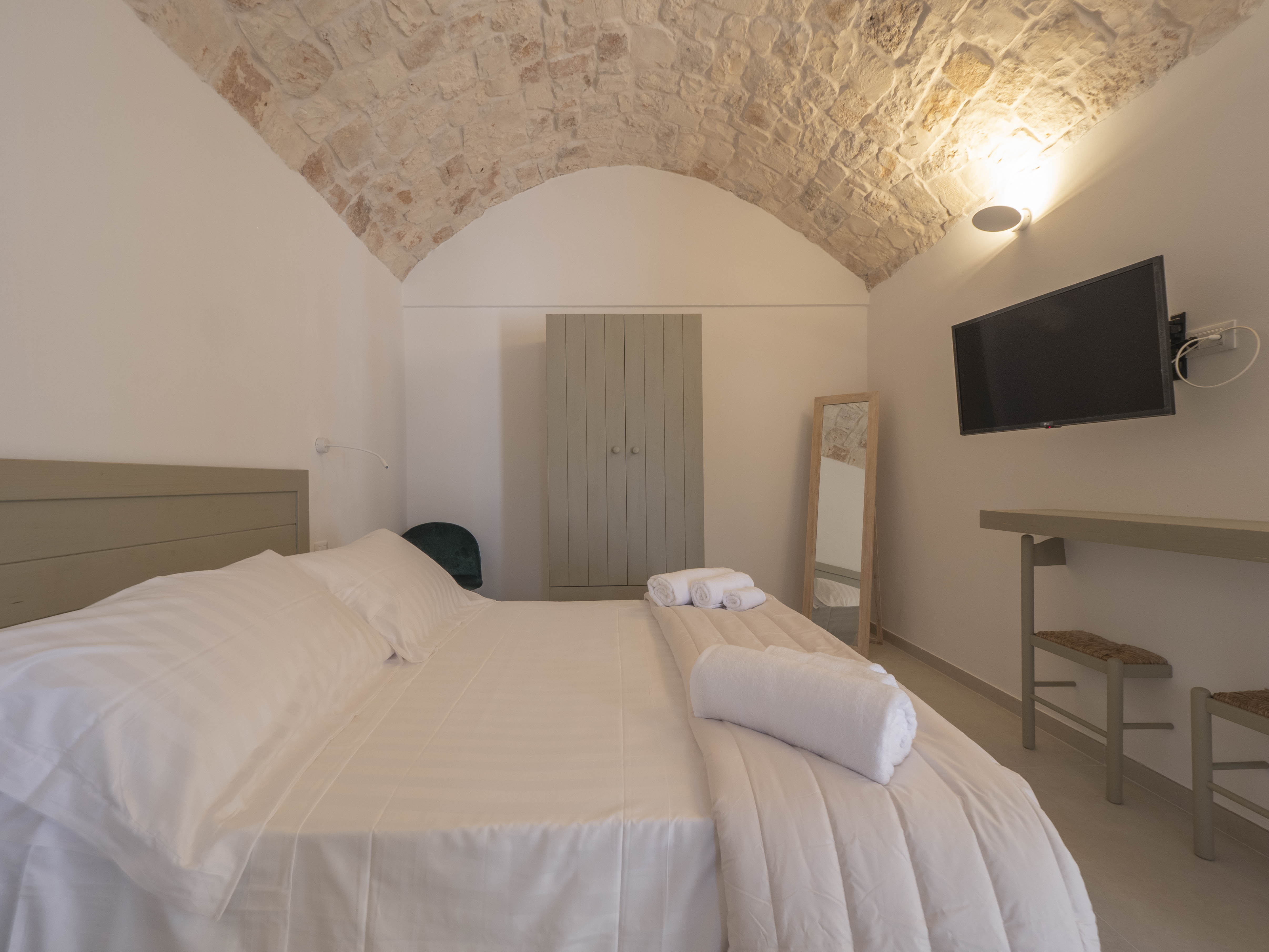 The structure consists of two independent bodies: a historic trullo with its cone vaults and a lamia with stone barrel vaults, framed by dry stone walls and ancient olive trees. Inside the trullo is a cozy living area with a dining table, where the living stone and natural light create a cozy atmosphere. Next door, under the alcove, is a functional kitchen in support of the well-equipped outdoor kitchen. The Trullo has two double bedrooms, both with both internal and independent access from outside. One of the rooms has an ensuite bathroom, while a second bathroom is available to guests, both complete with shower. A small hallway room also houses a comfortable sofa bed, ideal for accommodating two additional people or creating a private reading space.Inside the Lamia, two double bedrooms with a central bathroom complete with shower serve them. Outside, both structures have a pergola in elevation equipped with some tables and seating. In front of the pool, a large glass-enclosed gazebo gathers the outdoor kitchen equipped and complete with barbecue.